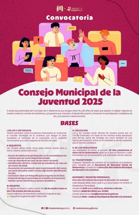 H. Matamoros, Tamaulipas.- El Consejo Municipal de la Juventud 2025 abre su convocatoria para jóvenes de 15 a 29 años que deseen ser parte de un espacio de participación, diálogo y acción orientado al desarrollo de Matamoros.