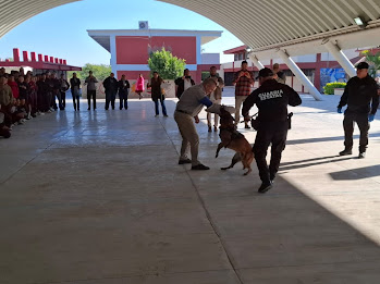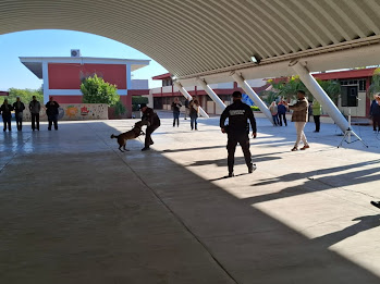 Las acciones incluyeron inspecciones preventivas mediante el uso de seudoaromas de narcóticos en cajas referenciales, así como ejercicios de obediencia, socialización y proximidad con el personal docente y el alumnado, con el objetivo de fortalecer la cultura de prevención y promover entornos escolares seguros.