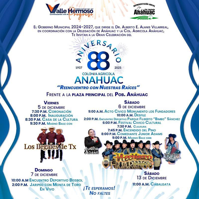 El Gobierno Municipal 2024–2027 que dirige el Dr. Alberto E. Alanis Villarreal en coordinación con la Delegación de Anáhuac y La Colonia Agrícola Anáhuac, invita a todas las familias a ser parte del inicio de las celebraciones por el 88 Aniversario del Poblado Anáhuac, bajo el lema “Reencuentro con Nuestras Raíces”.