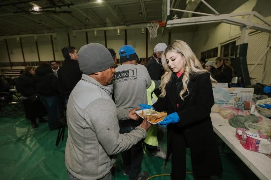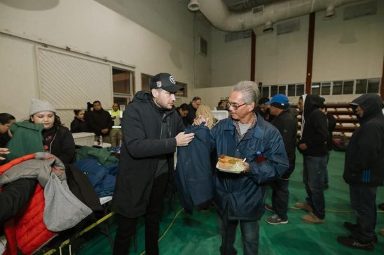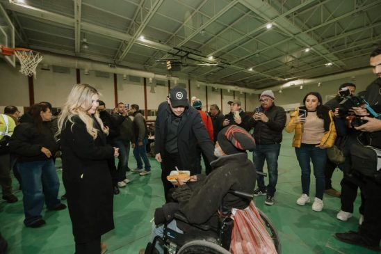 H. Matamoros, Tamaulipas.- Acompañado por la presidenta del Sistema DIF Matamoros, Anita Granados, el presidente municipal, Beto Granados, acudió al albergue Alberca Chávez para brindar apoyo a las personas resguardadas ante las bajas temperaturas, entregando alimentos calientes, chamarras y cobijas y algunos otros artículos para el frío a quienes más lo necesitan; señaló que este albergue permanecerá abierto todo el tiempo que sea necesario.