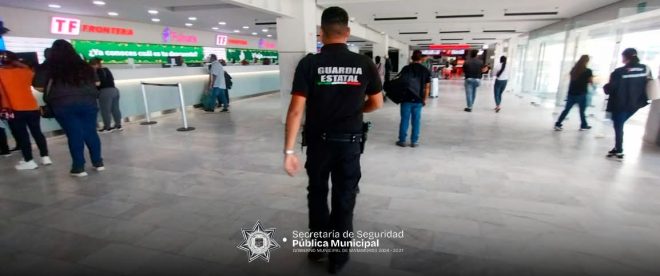 Matamoros, Tamaulipas.- Elementos de la Policía de Proximidad, en coordinación con la Guardia Estatal, mantienen de forma permanente un operativo de vigilancia en la Central de Autobuses y sus alrededores, como parte de las acciones preventivas implementadas durante el periodo vacacional. Estas labores se realizan de manera continua, con presencia día y noche, para salvaguardar a la ciudadanía y fortalecer la prevención del delito.