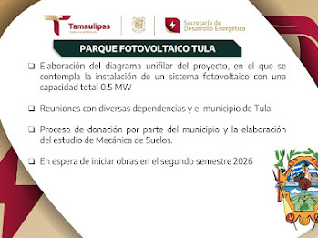 Ciudad Victoria, Tamaulipas.– Como parte del compromiso del Gobierno de Américo Villarreal para dar paso a la transición energética y el impulso a las energías limpias, la Secretaría de Desarrollo Energético anunció que se trabaja en un proyecto fotovoltaico en el municipio de Tula.